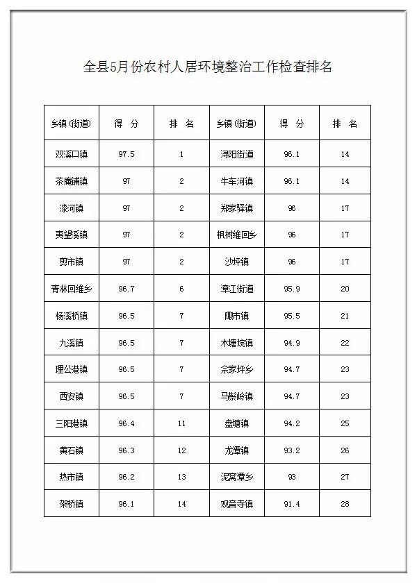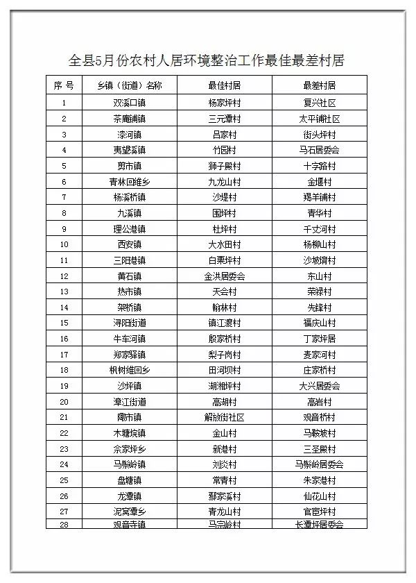 5月28日至30日,县农村人居环境整治三年行动指挥部抽调各乡镇(街道)分管领导,分组对五月份的农村人居环境整治工作进行了推磨式检查,现将乡镇(街道)检查结果排名暨“最佳最差”村居情况公示如下: