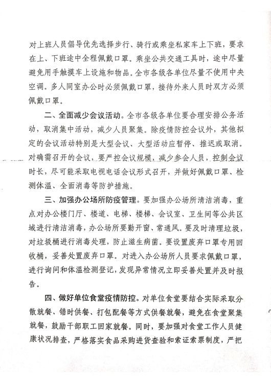 一、严格落实干部职工疫情防护措施。要督促干部职工如实报告个人自疫情发生以来的具体行程、密切接触者、身体状况等情况,根据实际情况落实相关防控措施。对尚在隔离或居家观察期间的人员,要严格落实隔离措施,隔离期未满前不得返岗工作。对上班人员倡导优先选择步行、骑行或乘坐私家车上下班,要求在上、下班途中全程佩戴口罩。乘坐公共交通工具时,途中尽量避免用手触摸车上设施和物品。全市各级各单位尽量不使用中央空调。多人同室办公时必须佩戴口罩,接待外来人员时双方必须佩戴口罩。