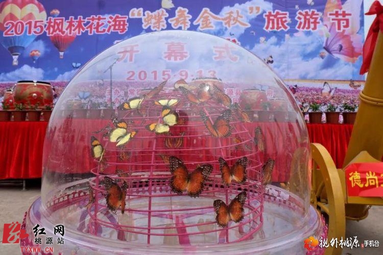 2015年9月13日,枫林花海“蝶舞金秋”旅游节开幕,现场放飞的近万只彩蝶、彩球纷纷飞舞。