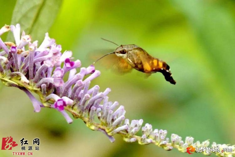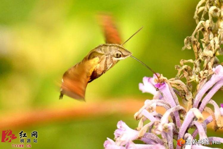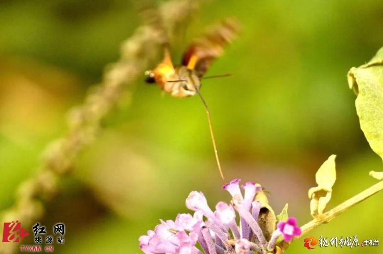 我们从集镇旁边选了一条通往乡村的小路边走边拍,在一池塘边拍摄蝴蝶时,拍到了这种像鸟、像蜂、像蝶、又像蛾的“四不像”昆虫在花丛中盘旋飞舞,采食花蜜的身姿,很是惹人喜爱。后来才知道这是一种被称为昆虫世界里“四不像”的蜂鸟鹰蛾。这一组照片也一度成为“网红”,被世界各地数百家媒体采用。