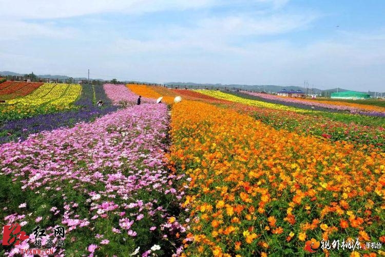 2015年10月11日,枫林花海里,由百日草、醉蝶花、蓝花鼠尾草等为主组成的“五彩花田”让游人陶醉在金秋的美景里。这些花花期很长,可以从六月开到九月,一望无际的缤纷花海如画卷,让人心旷神怡。