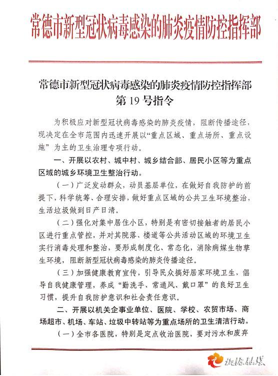常德市新型冠状病毒感染的肺炎疫情防控指挥部第19号指令