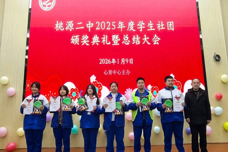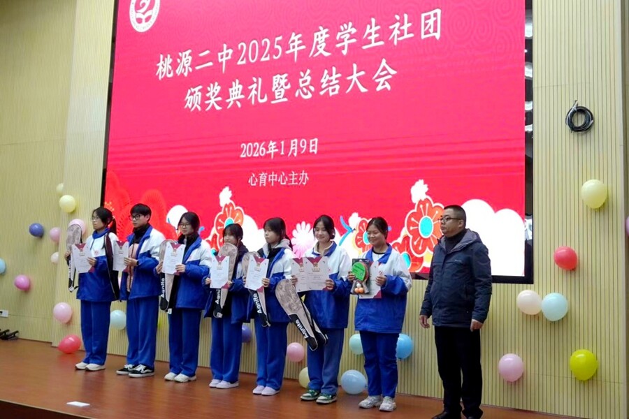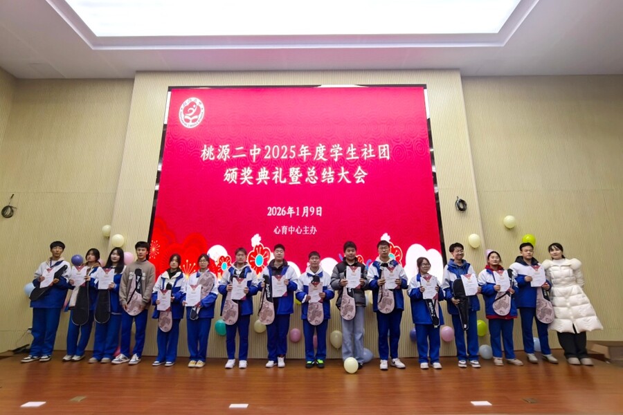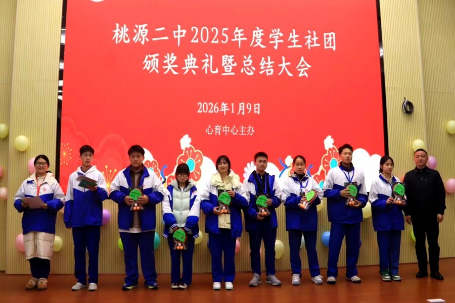 近日,桃源二中报告厅内灯光璀璨、掌声雷动,2025年度学生社团颁奖典礼暨总结大会在此举行。全体社团成员齐聚一堂,共同回顾社团年度成果,展望未来发展。