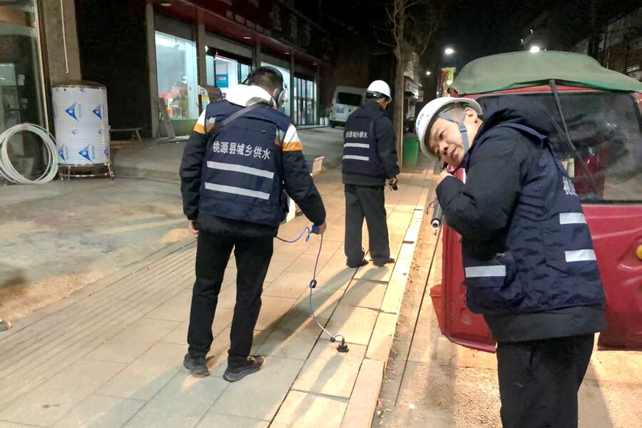群众安危刻不容缓,公司迅速响应派出4名骨干技术力量组成听查漏队伍,携带专业设备第一时间赶赴现场。抵达现场后,考虑到该路段地下管线错综复杂,队员们迅速实地勘察现场环境并摸清管网布局。为避免检测精度受到干扰,队员们决定于深夜开展排查工作,以确保漏点定位准确。