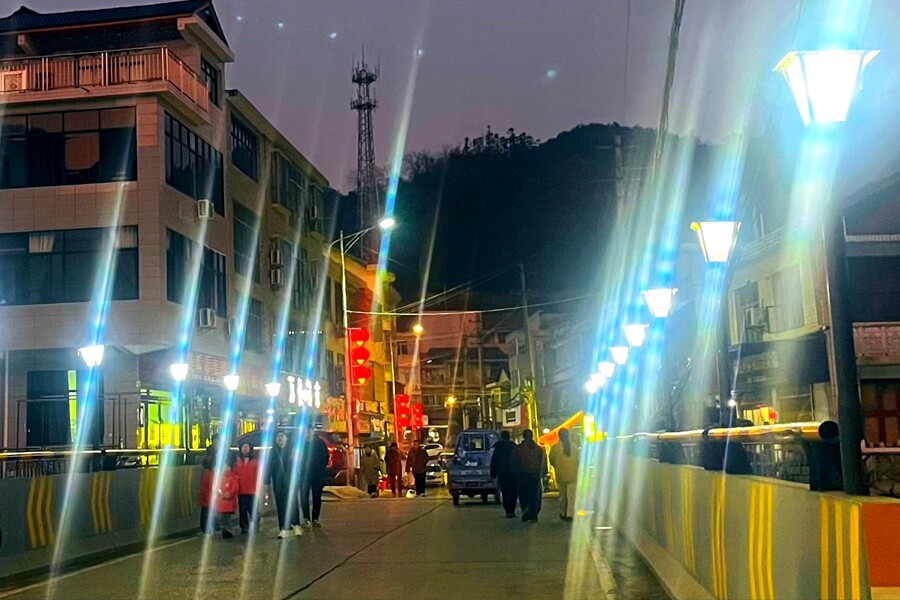 夜幕降临时,暖红色的灯光与街道夜景交相辉映,不仅点亮了返乡游子的归家路,也烘托出喜庆热烈的传统年味,引得过往居民纷纷驻足拍照。