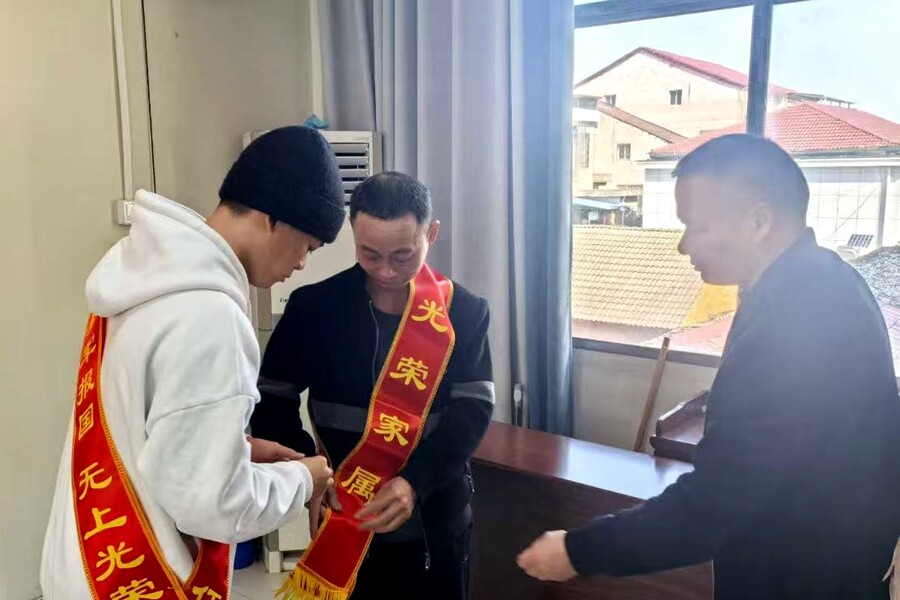 授荣表彰环节作为欢送会的高光时刻,温情满满、振奋人心。镇党委副书记、镇武装部副部长共同为新兵佩戴象征荣誉的“入伍光荣”大红花,鲜红的花朵映衬着青年们昂扬的面庞,尽显参军报国的荣光;新兵们也亲手为父母佩戴“光荣家属”绶带,一句句感恩的话语、一个个深情的拥抱、一张张定格幸福的合影,让“一人参军、全家光荣”的浓厚氛围浸润全场,也让爱国拥军的理念深深扎根人心。