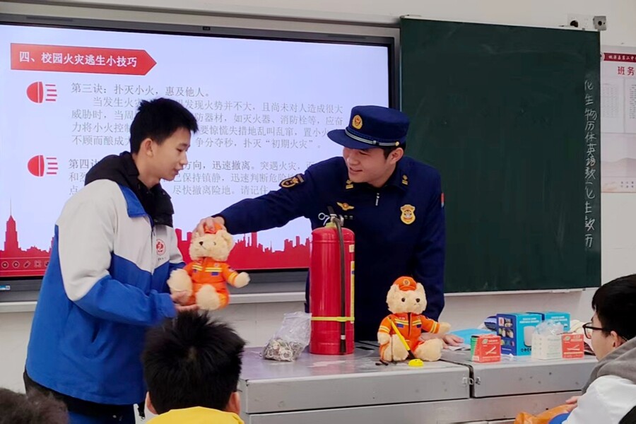 为增强活动互动性和学习趣味性,活动设置了消防安全知识问答送礼品环节,消防救援人员围绕一氧化碳中毒后应急处理、消防通道宽度标准、防烟面罩使用方法等知识点现场提问,师生们踊跃举手、积极抢答,现场氛围热烈。答对问题的师生还收获了消防小熊、消防帆布挎包、消防鼠标垫等精美消防文创礼品,在轻松愉悦的氛围中巩固了消防安全知识。培训最后,消防救援人员着重讲解火灾报警的正确流程,反复强调报警时需清晰说明火灾具体地址、着火物类型、是否有人被困等关键信息,确保消防救援力量能快速、精准抵达现场开展处置。