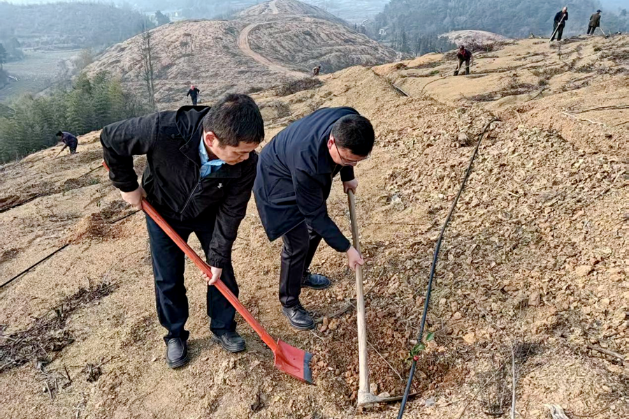 “树坑要挖到40公分深,回填土要踩实,苗木才能扎根。”有着20年种植经验的王叔一边示范一边叮嘱。年轻干部虚心学习、干劲十足,几人一组密切配合,裤腿上沾满泥土也毫不在意。经过两个多小时的奋战,原本空旷的荒坡地和新修道路两旁,800株新苗整齐列队、迎风挺立,在春日暖阳中焕发出勃勃生机。