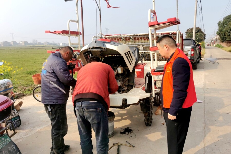 在检修现场,一台台插(抛)秧机、拖拉机、旋耕机整齐排列,等待着技术人员的“体检”。技术人员为农机设备更换机油、紧固零件、调试性能,逐一排查故障隐患,确保农机具“健康”上岗、安全作业。同时,随行的农机监理人员还向机手宣讲机具安全操作规范、日常保养等知识,从源头防范农机作业安全风险。