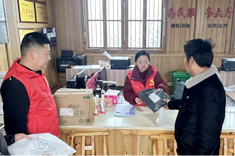 马路坪村依托党群服务中心,联动邮政站点搭建便民服务平台,村干部化身代办员、带货员、快递员,在党群服务中心为群众免费代收代取快递,同时助力农户代销农产品,打通农产品出村、消费品进村的双向通道。