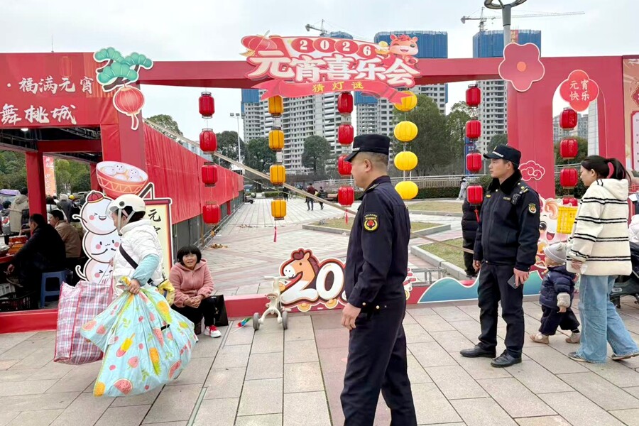 环卫服务中心加大活动区域及周边道路的清扫保洁与垃圾清运频次,共清理各类垃圾约2.8吨,确保市容环境整洁美观。路灯管理站提前开展检修维护,累计维修路灯22盏、中国结灯笼5组,保障活动期间城区路灯、景观灯、楼宇亮化灯全部正常点亮,亮灯率达到100%,璀璨灯光映衬出浓厚的节日氛围。与此同时,城管执法队员持续开展烟花爆竹禁燃限放巡查,执勤至凌晨1点,全力守护城区安全与环保底线。
