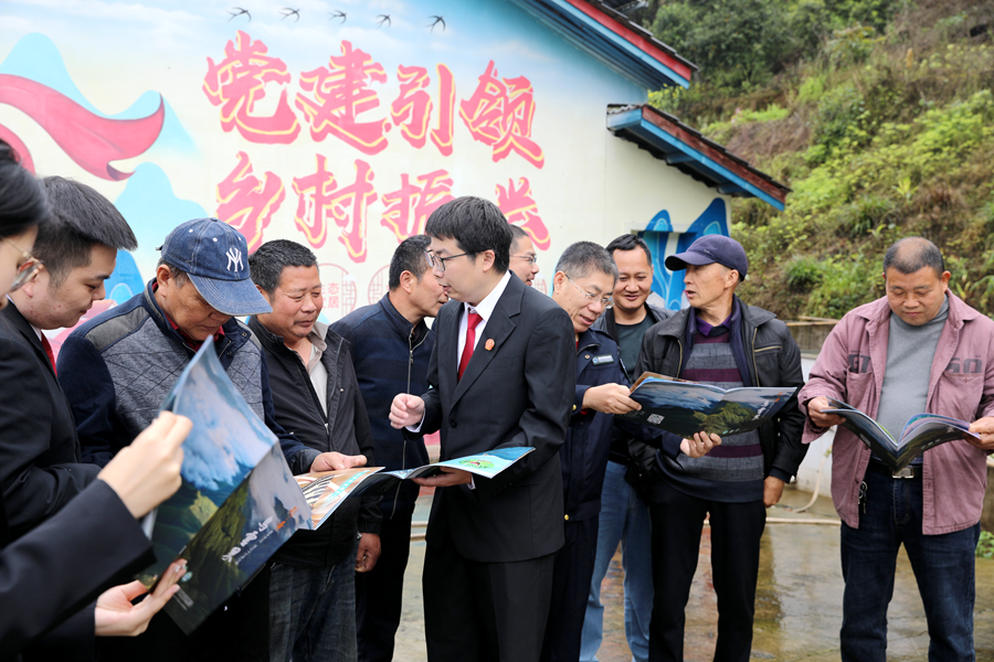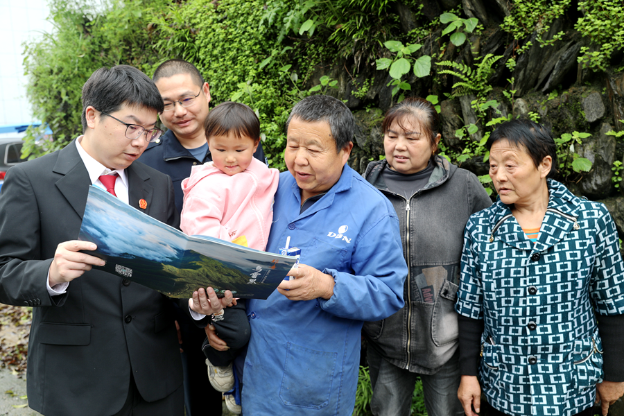 4 月 16 日上午,在沙坪镇赛阳村,村民们看到湖南乌云界国家级自然保护区管理局生态环境研究所与县人民法院桃花源法庭联合开展的普法宣传活动,纷纷围拢过来,言语间满是对家乡优良生态环境的自豪之情。