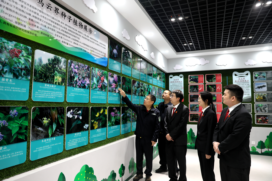活动伊始,县人民法院桃花源法庭的法官们走进乌云界国家级自然保护区管理局生态环境研究所,先后参观了珍稀动植物展室、珍稀蝴蝶展室,全面了解保护区内动植物资源分布、物种种类及生态保护工作开展成效,近距离感受乌云界得天独厚的生态禀赋与生机勃勃的自然风貌。看着保护区内品类丰富、长势良好的各类动植物,感受着桃源清新优美的生态环境,法官们纷纷由衷赞叹,对乌云界保护区丰富的生物多样性与卓有成效的生态保护成果表示高度认可,也进一步深化了对生态环境保护司法履职重要性的认识。