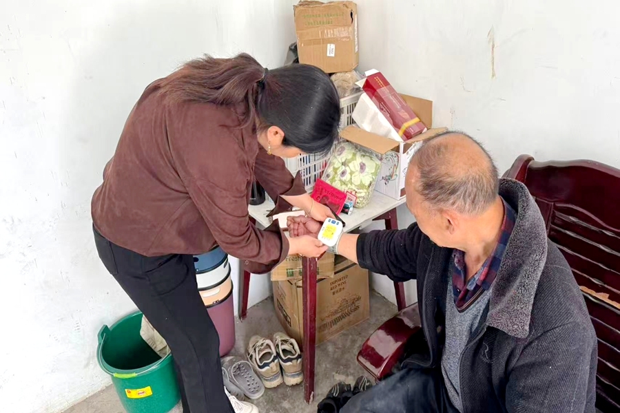 理论宣讲后,刘小华上门为高龄老人、行动不便者、残疾人等特殊群体免费测量血压,询问健康与用药情况,分析血压数据,提供个性化调理与就医指导,把健康服务送到群众家中。