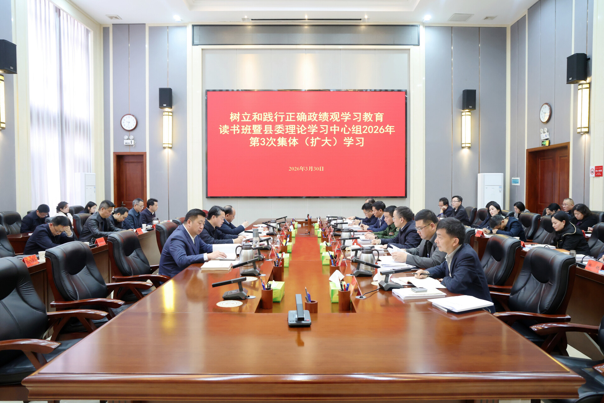 3月30日上午,市委常委、县委书记黄伟雄主持树立和践行正确政绩观学习教育读书班暨县委理论学习中心组2026年第3次集体(扩大)学习,强调要深入学习贯彻习近平总书记关于树立和践行正确政绩观的重要论述精神,以更高站位强化对标对表的政治自觉,推动学习教育入脑入心、走深走实,为“十五五”良好开局提供坚强保障。县委副书记、县长马吉云出席。