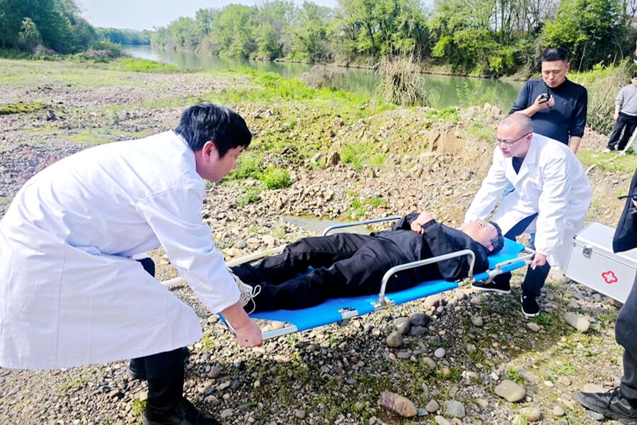 下午3时,实战演练正式启动。“报告指挥部!麦市垸堤东侧山林有火情,东风,周边多杂草灌木!”巡护人员快速上报火情,指挥部立即启动应急响应,扑火、应急、后勤队伍迅速集结赶赴现场。前线组、警戒组同步开展警戒与人员疏散,“此处正在开展森林防灭火演练,请勿进入警戒区域,勿随意拍摄、乱传相关视频,感谢配合!”扑火队伍分工协作,同步开展明火压制、防火隔离带开设工作。期间,一名扑火队员突发中暑、踉跄倒地、呼吸急促,现场队员立即上报,指挥部迅速调度医护组驰援。医护人员携带急救箱、担架快速抵达,熟练完成降温、补水等应急处置,随后平稳将中暑队员抬上担架,转运至安全区域进一步救治。明火扑灭后,队员们细致清理余火,确认无复燃风险后向指挥部汇报,森林防灭火应急处置演练圆满完成。