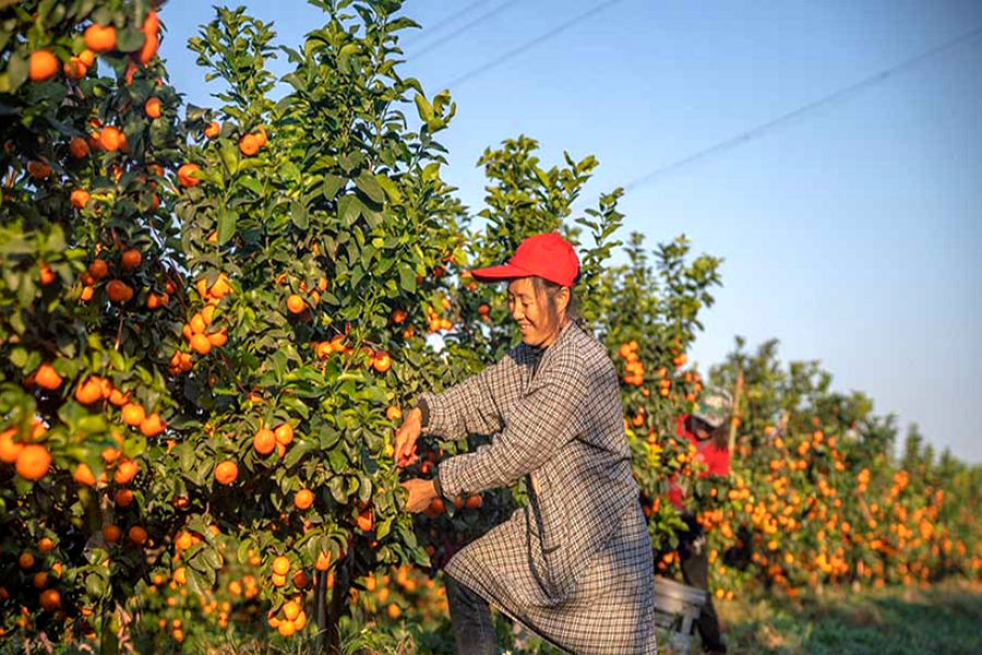 十一月,是丰收的季节。来到热市镇郝仙坪居委会计生家庭戴振球种植的300亩家庭橘园里,漫山遍野的富硒柑橘,三五成串挂满枝头,压弯了腰,在冬日暖阳的照耀下,散发着一阵阵果香。村民们正在忙着剪下累累硕果,一筐筐色泽鲜亮、果肉多汁的柑橘从田间挑到水泥路上,随后搬上三轮车运往仓库,到处都是火热丰收的景象。