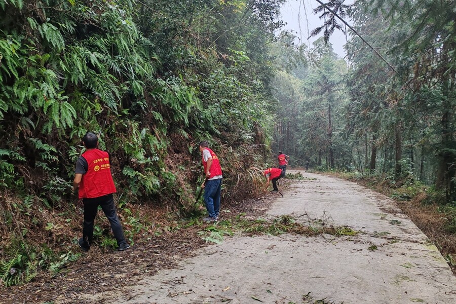 捉儿坳组级公路山高坡陡,荆棘杂草长期侵占路面,严重威胁村民出行安全。沙坪村油溪党支部直接将“主题党日”活动阵地前移至山路,镰刀在阳光下闪烁,汗水顺着草帽边缘滴落,十余名党员顶着三十多度的烈日炙烤,连续奋战七个小时。