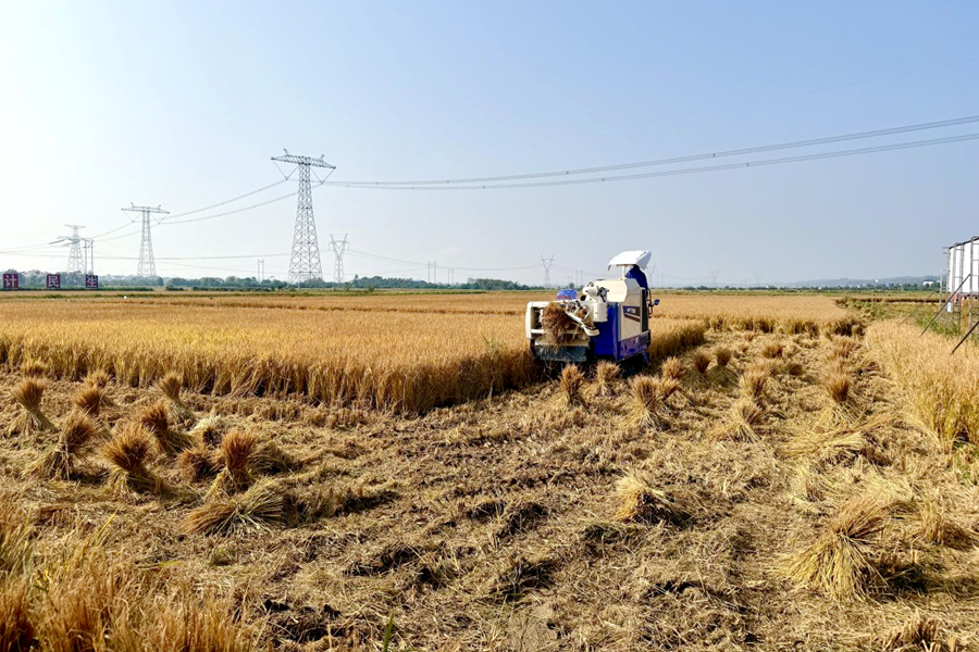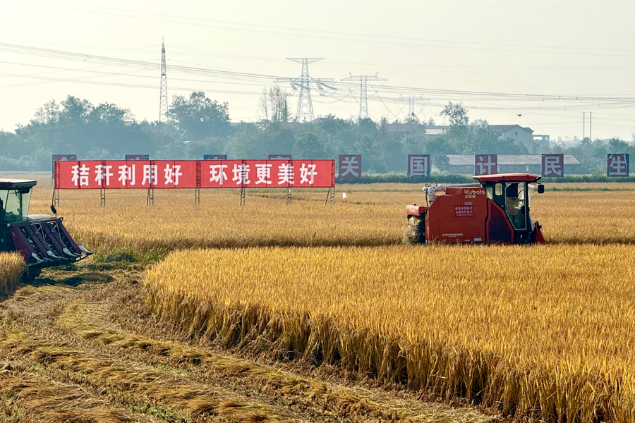 除了收割机在田间作业外,几台新型打捆机格外抢眼,它们沿着一垄垄秸秆快速行驶,“吞”下大量秸秆后,每隔约2分钟便会“吐”出一个高约1米、重约30斤的圆柱体秸秆捆,放眼望去,蔚为壮观,“机械化收割+秸秆离田”一体化作业模式,不仅让稻收跑出“加速度”,更让秸秆“变废为宝”。秸秆粉碎还田机深度作业,将秸秆彻底粉碎并均匀混埋于土壤中,实现了“取之于田,还之于田”的生态循环。新型灭茬旋耕机则展示了“一步到位”的作业能力,一次性完成秸秆粉碎、灭茬和旋耕。