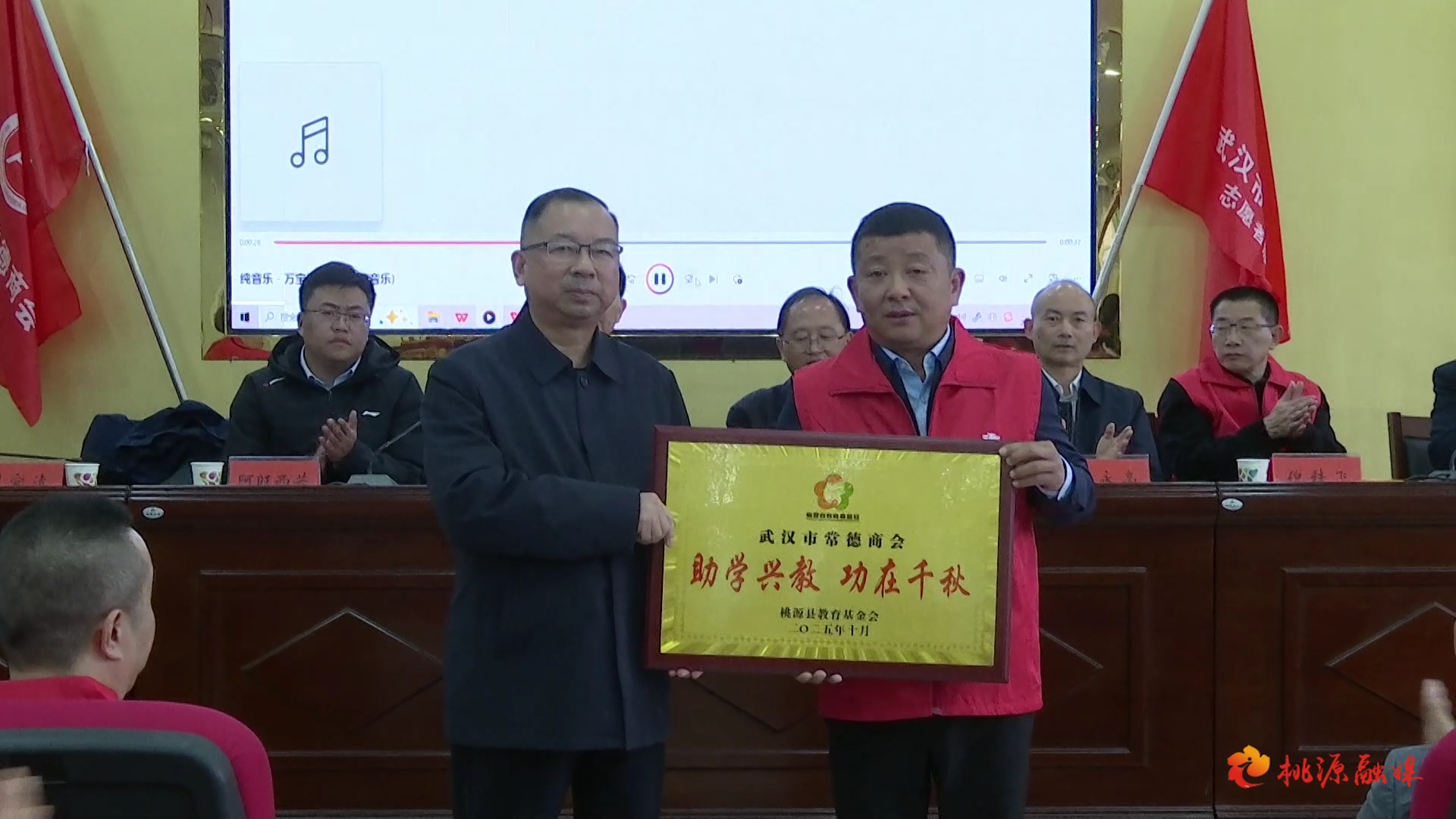 仪式上,武汉市常德商会现场向桃源县教育基金会捐赠15万元助学资金,县教育基金会回赠“助学兴教,功在千秋”牌匾。随后,与会领导及商会代表为30名贫困学生发放助学金,为8名优秀教师颁发奖励金。