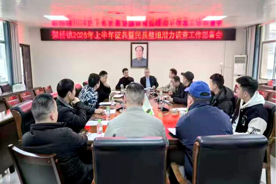 近日,架桥镇召开2026年上半年征兵工作暨民兵整组潜力调查部署会,统筹部署、协同推进两项重点工作落地见效。镇武装部全体干部、各村(社区)党支部书记、民兵连长及相关部门负责人参加会议。