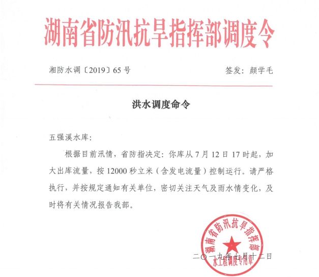 另据了解,今天,湖南省防汛抗旱指挥部下发第65号洪水调度命令,命令指出,五强溪水库:根据目前汛情,省防指决定:你库从7月12日17时起,加大出库流量,按12000秒立米(含发电流量)控制运行。请严格执行,并按规定通知有关单位,密切关注天气及雨水情变化,及时将有关情况报告我部。